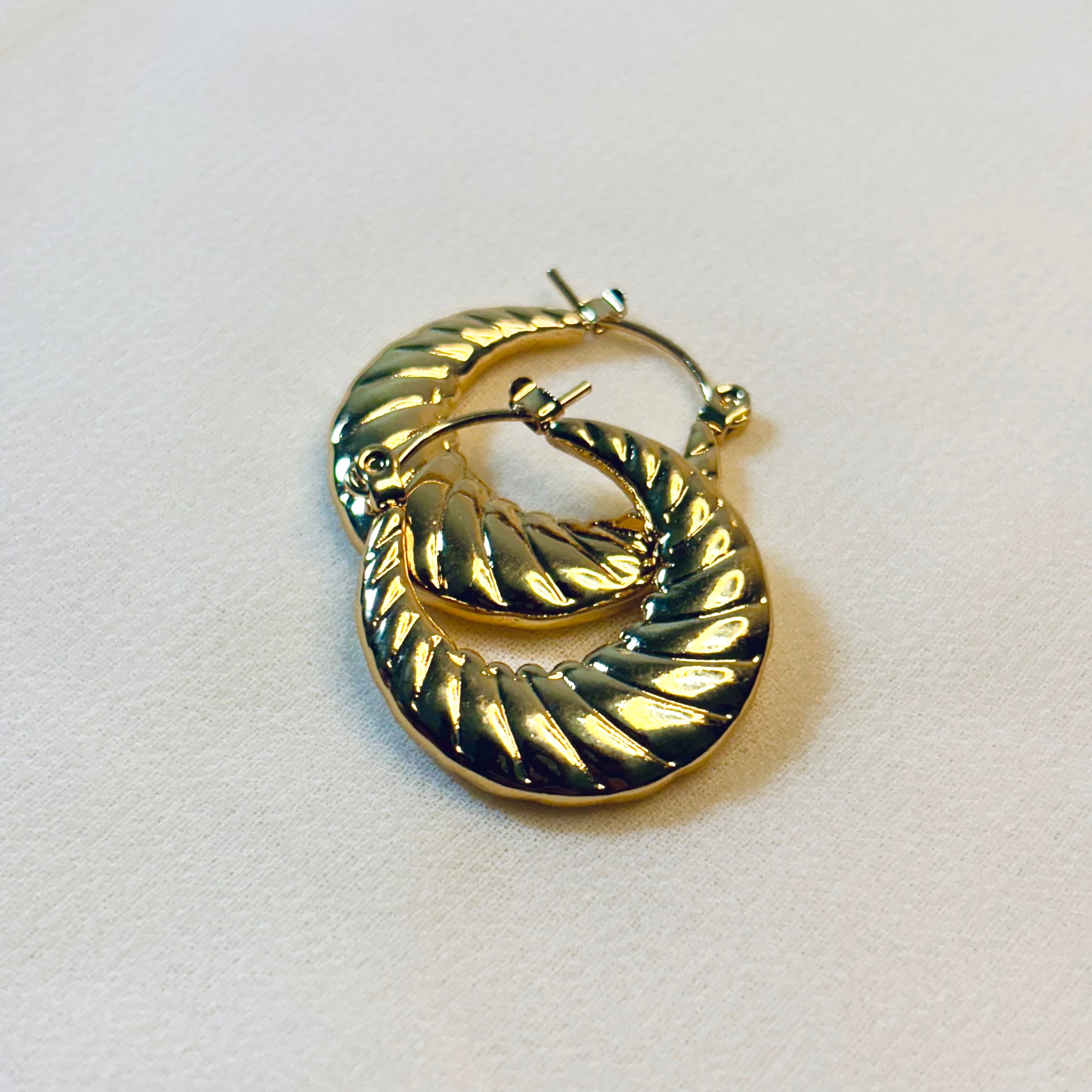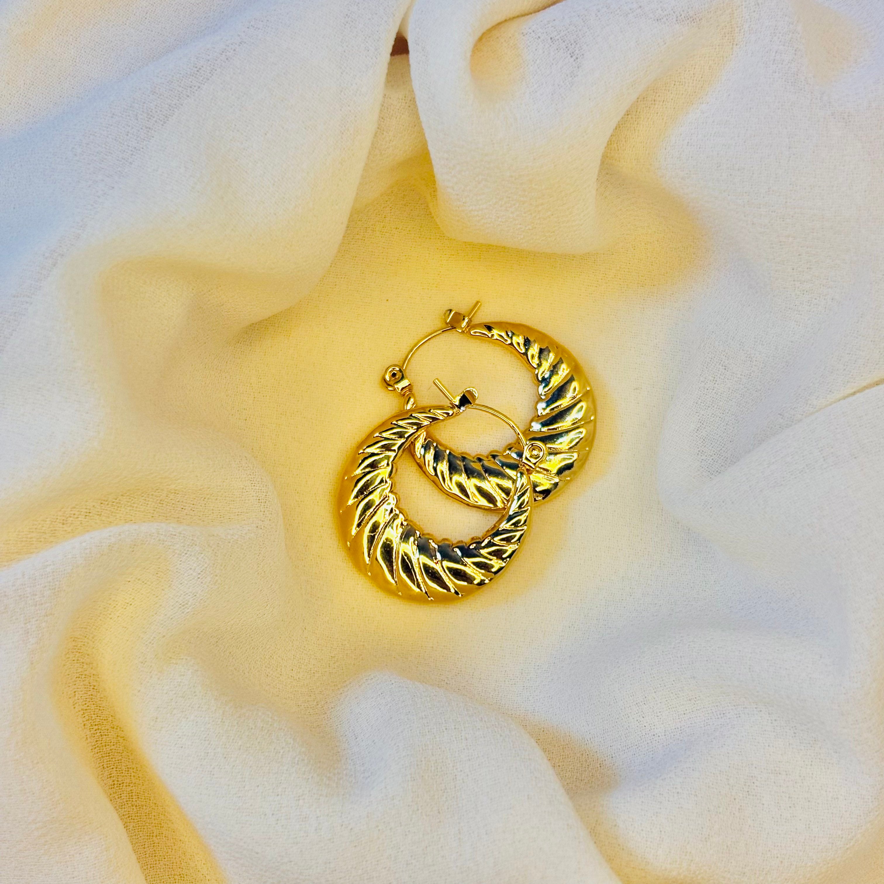 Make a bold yet elegant statement with these chunky croissant gold hoops. Inspired by the latest fashion trends, these earrings feature a unique ridged texture and a beautifully curved, puffy shape that adds a modern flair to a classic hoop design. The brilliant gold finish and high-quality craftsmanship make them a standout accessory for any occasion.