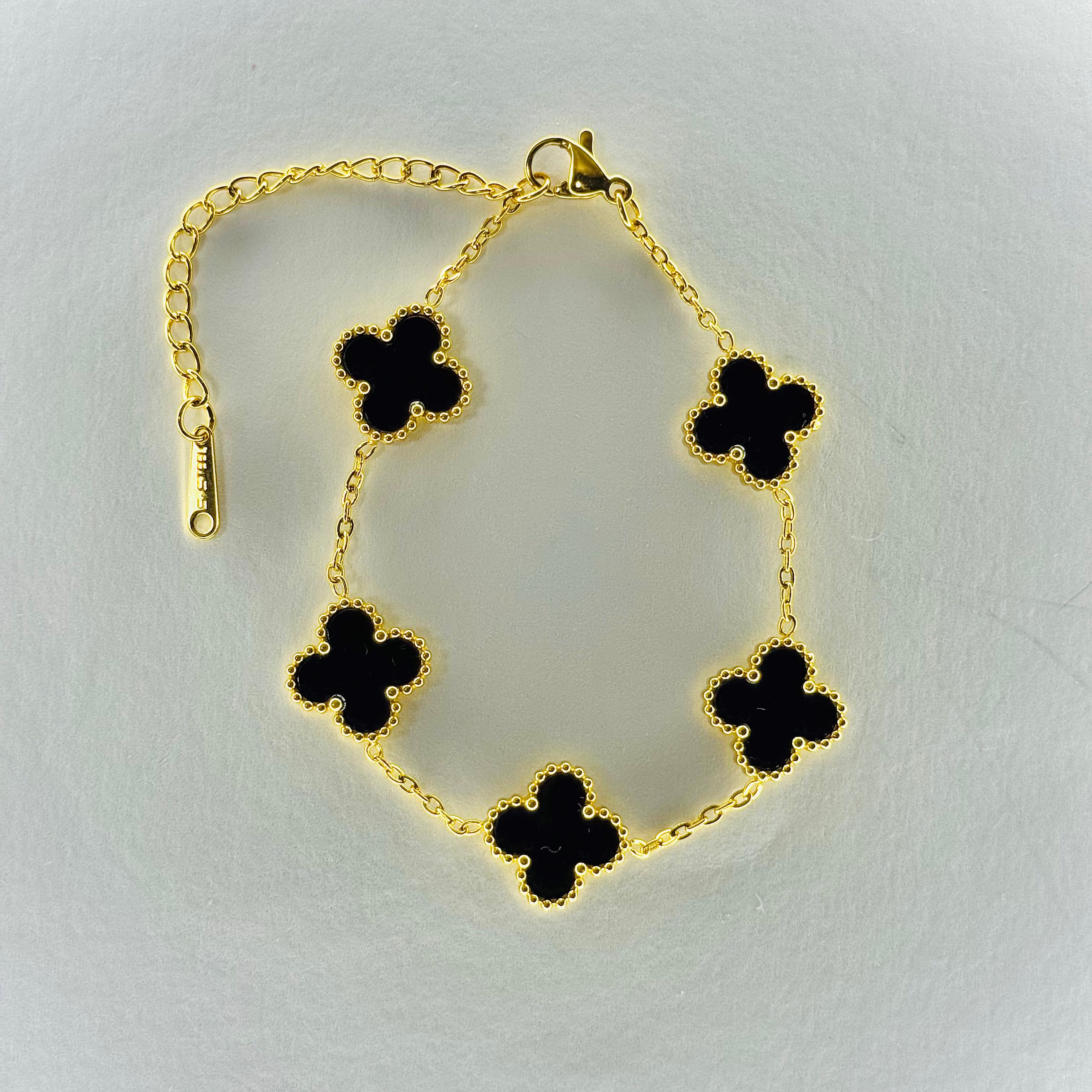 Add this black and gold clover bracelet to your collection and let its charm elevate your style.