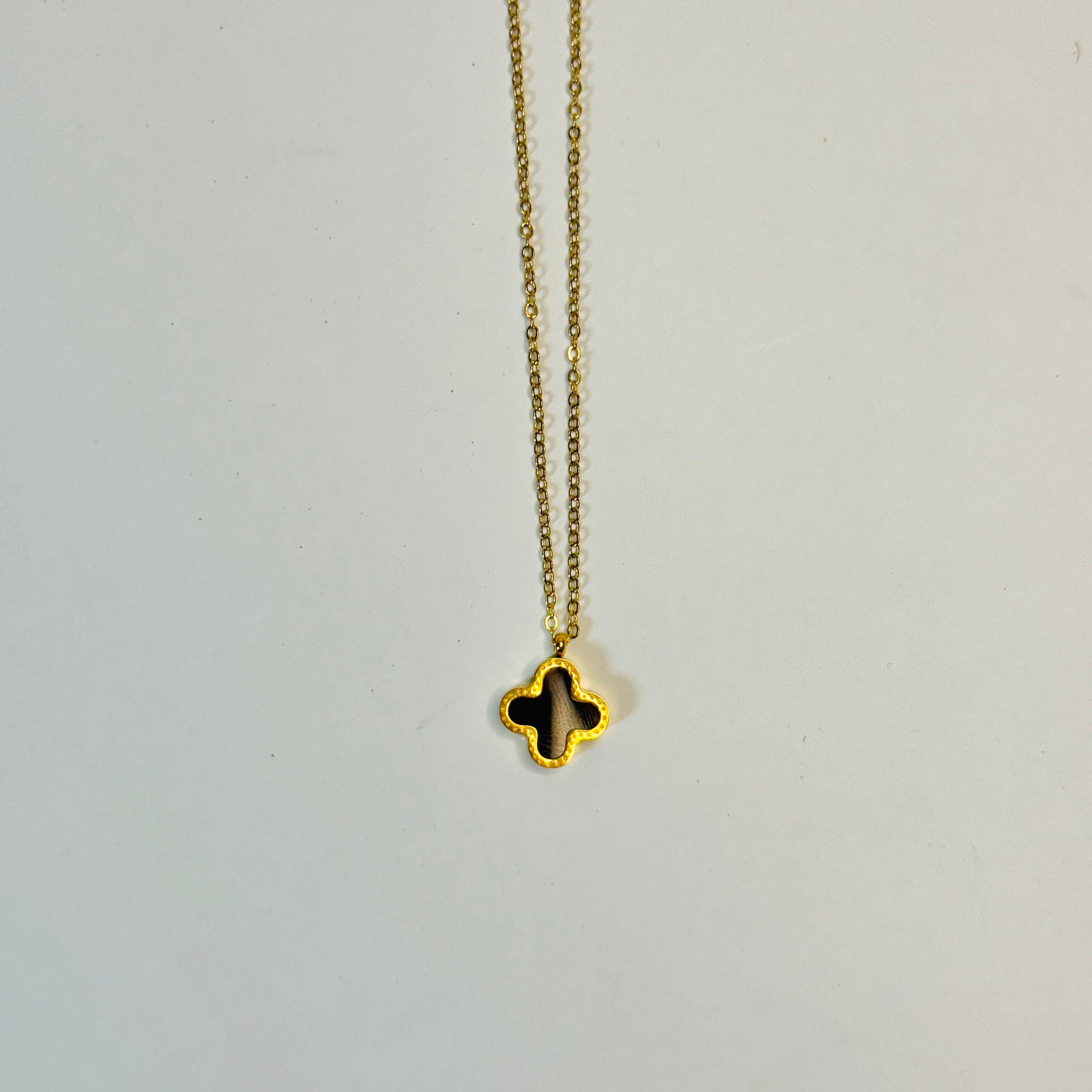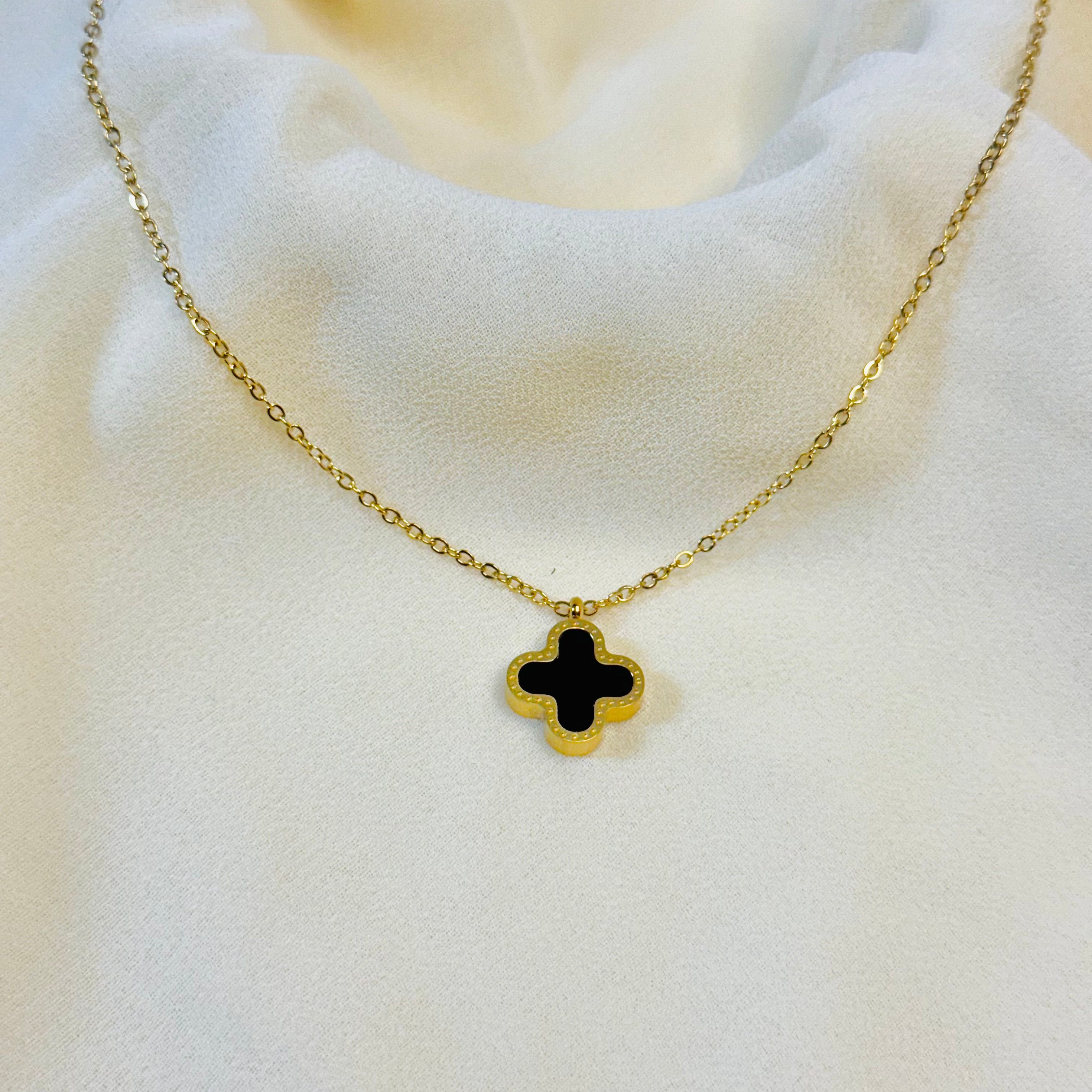 Add a touch of sophistication and luck to your look with this beautiful gold and black clover necklace.